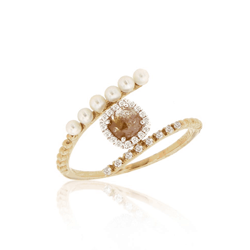 Product Description from Meira T "This unique design plays with the illusion of a floating rough diamond between the bands. The pearls add a feminine and delicate touch to this style. Diamond Weight: .59 cts"